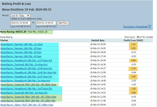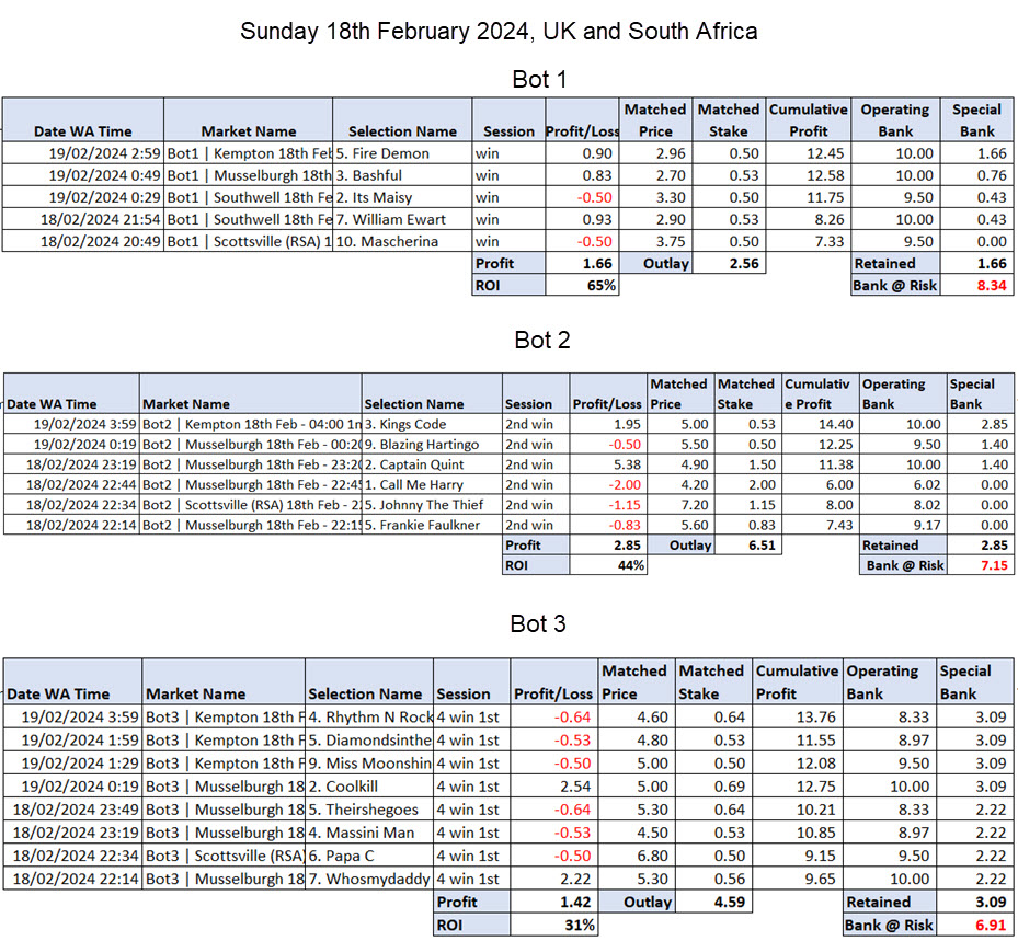 South Africa: Loss 2.79UK: Profit 8.6818th February, 2024Combined Aus, UK, NZ and South Africa = $21.28 ProfitAllocated Bank $30.00 71.00% Bank Growth